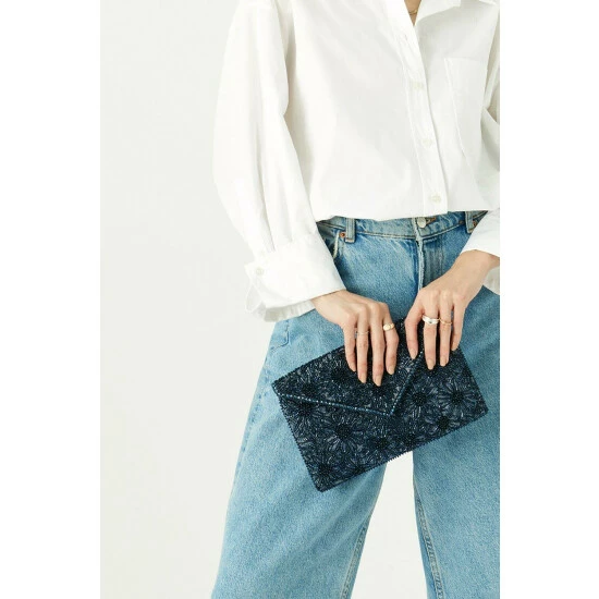 The Tara clutch is embellished with beads in a floral print that’s worthy of those extra-special occasions. It fastens with a magnetic press-stud and has an internal zip pocket for your coins, cards and notes. There’s also a detachable chain strap for hands-free holding.