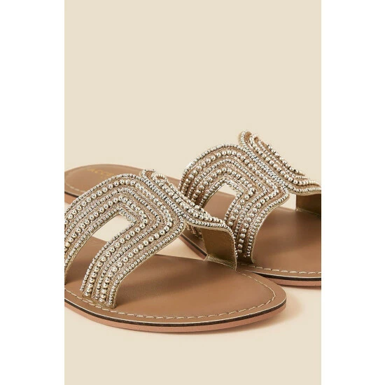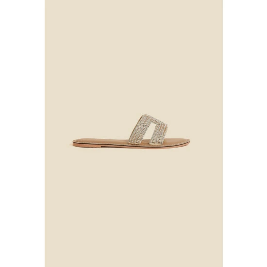 These chic sliders are embellished with gold-tone beads and metallic thread, making them a perfect choice for evenings on holiday.