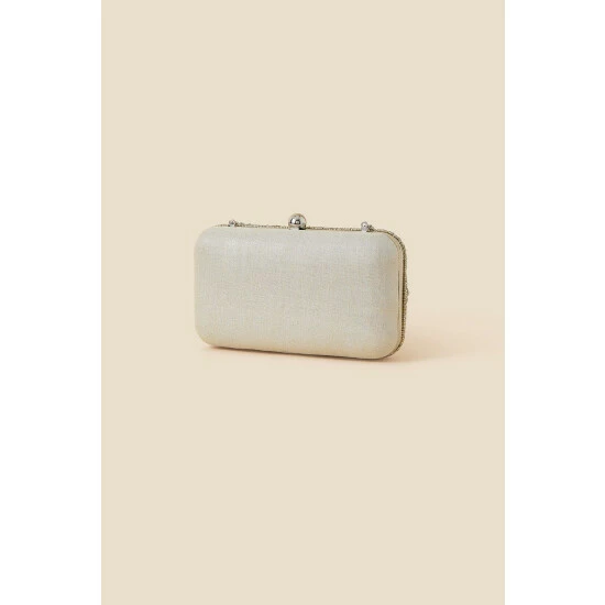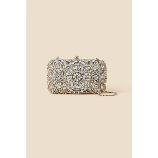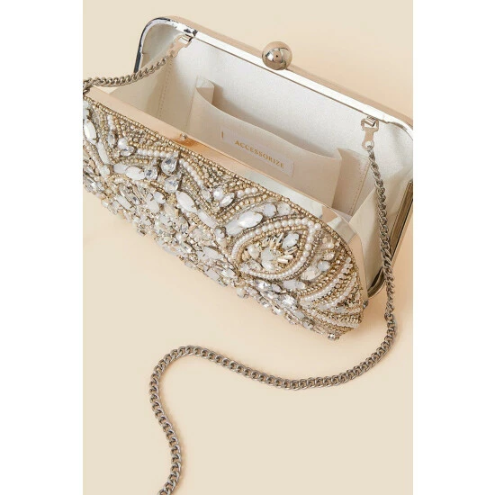 Continuing the special finishing touches on your big day, this bag was designed to carry your bridal essentials as you mingle through the night. To match your dress beautifully, it’s drenched in an array of faux-pearls and gemstones, in an icy-champagne colour palette. Fastening with a clipframe, it can be worn over the shoulder thanks to the optional chain strap – alternatively, tuck it inside for a neat in-hand style.
