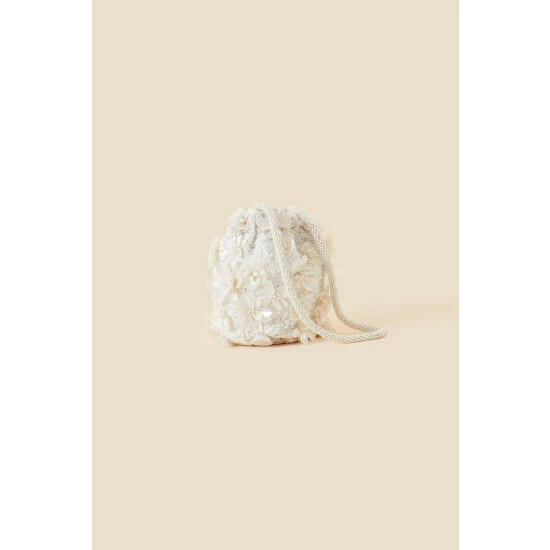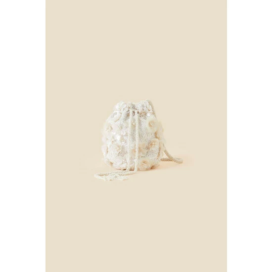 Embellished with a myriad of ivories, this bag is the perfect piece for casual brides. The main body is scattered with sequins, with pearl budded 3D flowers, whilst the drawstring and handheld straps features intricate beading. The bucket shape and soft profile will keep bridal essentials safe as they take on the dancefloor into the evening.