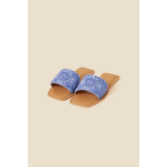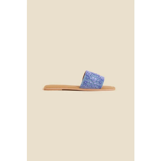 Step into holiday styling with our embellished sliders. Adorned with cornflour blue beading, these sandals exude a bohemian sense of glamour. They feature slightly padded footbeds for comfort.