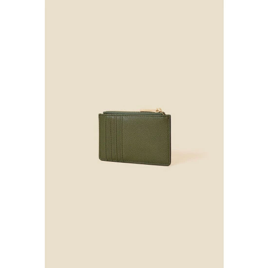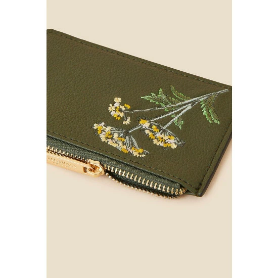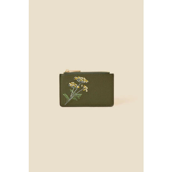 Going cashless for the evening? Keep this cardholder on hand to house your ID, credit card, and bank notes. Designed in khaki faux leather, find floral embroidery on the front and card slots on the reverse, with a small zip top for extra security for your loose change.
