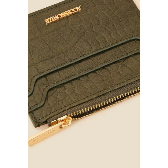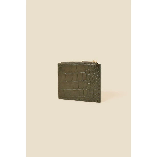 Going cashless for the evening? Keep this khaki cardholder on hand to house your ID, bank card, and travel card. Designed in mock croc leather, this piece boasts two card slots and a small zip-up pocket for emergency notes.