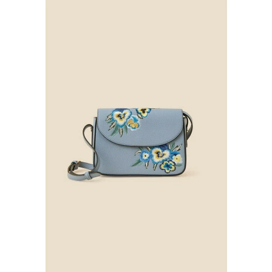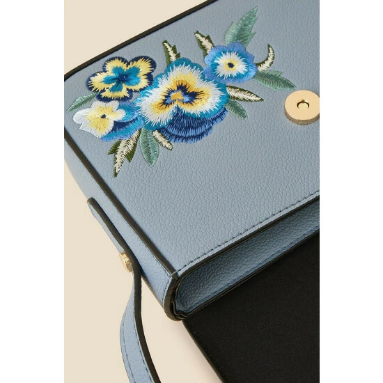 Finished in a dusty blue hue, this cross-body bag features aqua tone floral embroidery to the fold over flap. To the inside is enough room to house your daily essentials, fastening with a magnetic snap closure. Simply pop it over your shoulder or leg it hang cross-body with the adjustable strap.