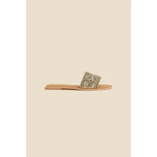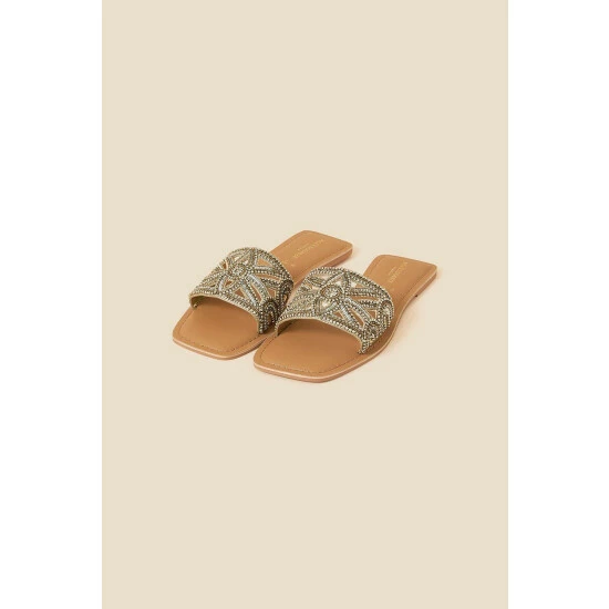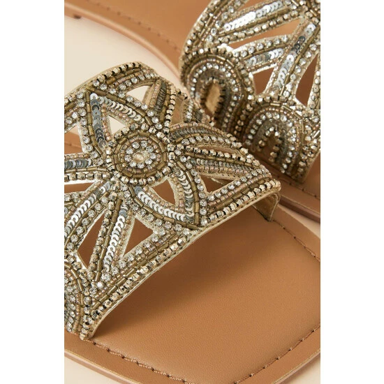 Sparkling florals adorn this pair of sliders, the perfect pair to keep by the apartment door on your holidays. The strap is embellished with diamantes and gold beading – suitable dazzling for a quick trip to the hotel bar.
