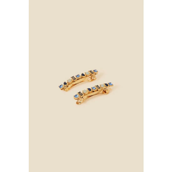 Sparkling with muted oceanic hues, these hair clips feature baguette gems atop a simple gold barette clip. Fastening with a hinged closure, these clips will secure the hair in place for half up, half down hair dos and side swept stylings. Two included.