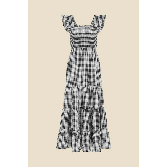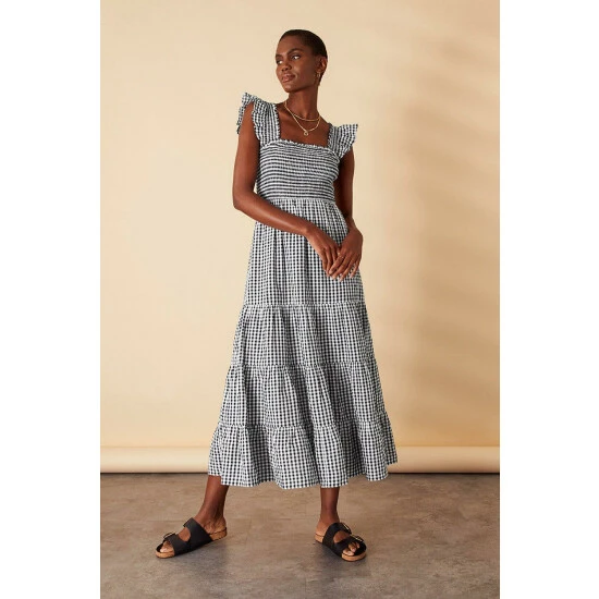 An effortless option for summer mornings, this dress combines monochrome gingham with a feminine tiered dress. The shirred bodice stretches to fit comfortably around your bust, with a square neck and flutter sleeves to finish.