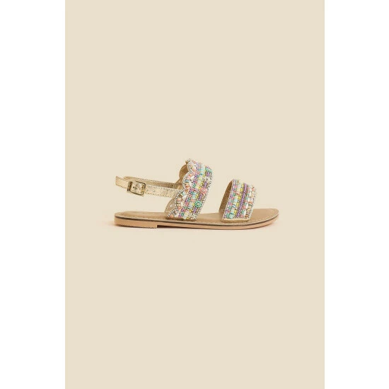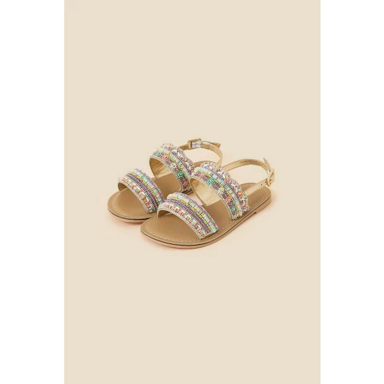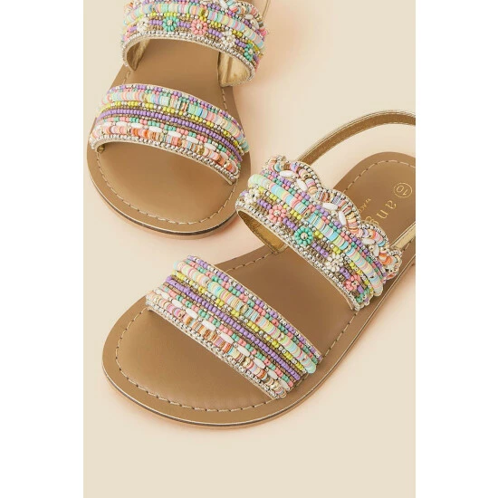 Leave it to these sandals to brighten their sunny day’s outfits. Ideal for summer and winter getaways, you’ll find teeny pastel beads embellished over the straps, with a scallop trim for a touch of fun. Fastens around the back of the ankle with a pin-buckle strap.