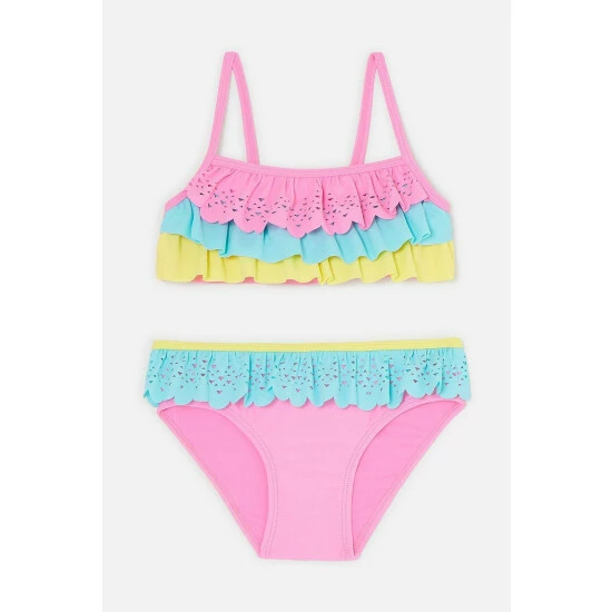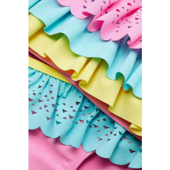 You won’t loose little ones on the beach with this bikini. It features layered pastels on ruffle detailing, with a laser cut finish to the top and bottoms.