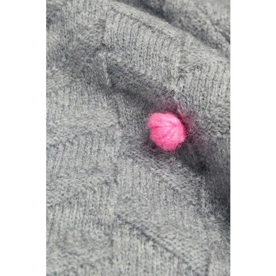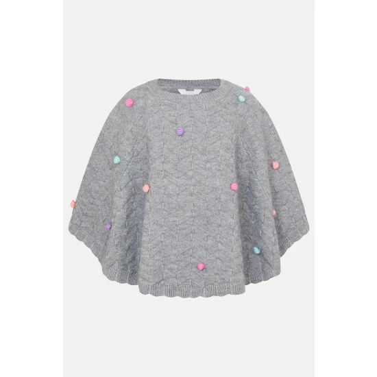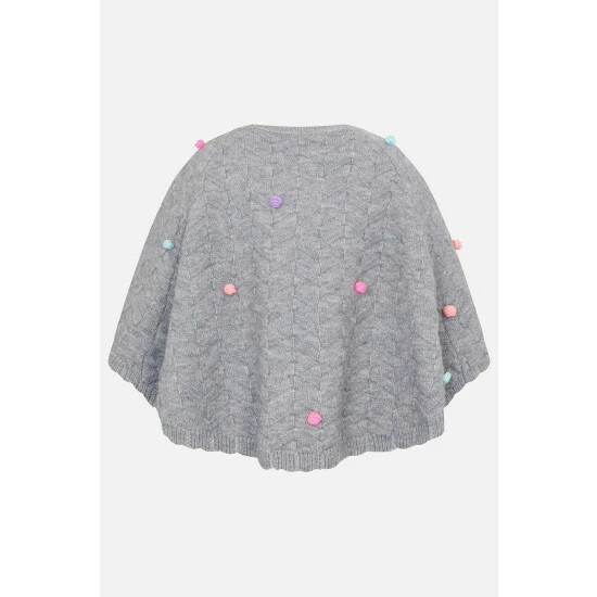 A gentle layer, but full of fun! This poncho boasts a detail knit, with a ribbed neckline and scallop trim finished with colourful pom-poms throughout.