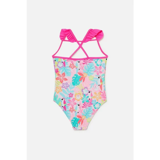 Little ones can learn how to swim in style with this one-piece swimsuit, crafted in a stretchy swim fabric. It features a super vibrant all over tropical print, including parrots, flowers, and leafs!