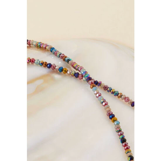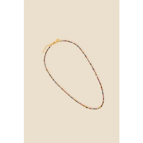 Threaded with an array of colourful beading, this necklace boasts iridescence that’ll shine under the summer sun, sitting beautifully in your holiday necklace stack. Fastens with a gold-plated lobster clasp.