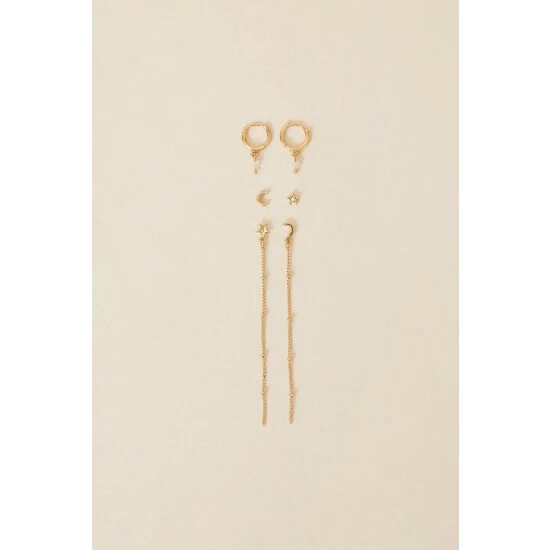 A celestial dream, this set of gold-plated earrings includes crescent moons, twinkly stars and luxe rose quartz – said to symbolise unconditional love, emotional healing and compassion. Choose from statement chain drops or simple studs, with additional huggie hoops that will pair beautifully with either design. Three pairs included.