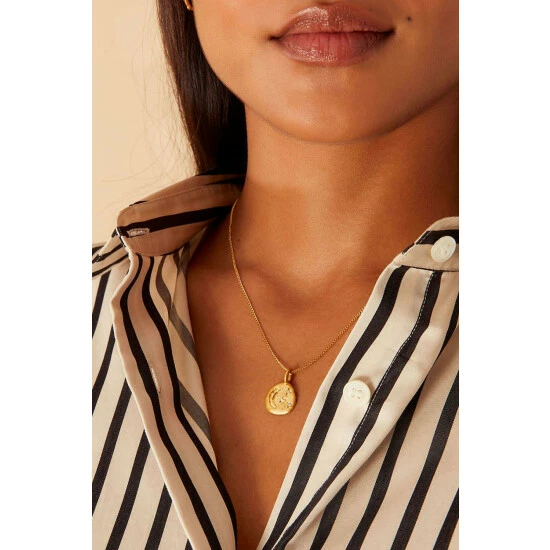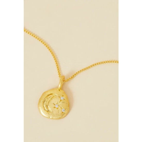 Admirably organic, this necklace promotes natural beauty in all with its imperfectly moulded gold-plated pendant. Embedded with cubic zirconia and moon etching, its celestial finish will add a magical touch to everyday.