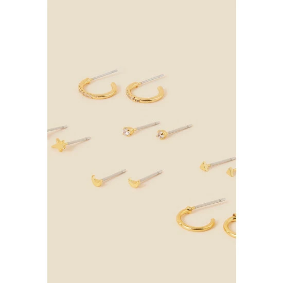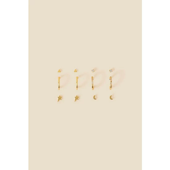 It’s not all moons and stars in this set, prepare for plenty of sparkles and more plain designs to mix-and-match throughout the week. Designed in gold-plated metal, slip them in during the morning and watch them complement your office-to-work drinks transition seamlessly. Includes four pairs of studs and two pairs of hoops.