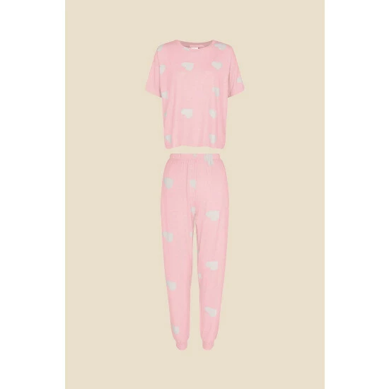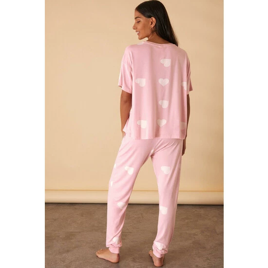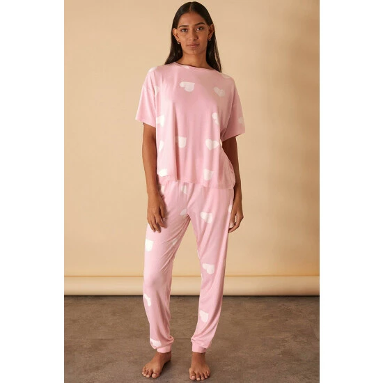 Feel snug, warm and full of love in this cosy PJ set, covered in a baby pink hue with hearts printed all-over. Designed in beautifully soft jersey, it features a long sleeve top that falls into a relaxed fit with tapered bottoms to match.