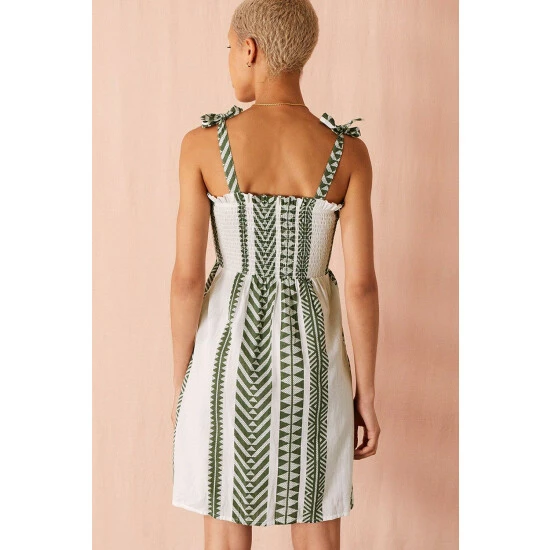 We see this dress sat on a picnic blanket, with nibbles, sunnies and a book scattered beside it. Perfect for warmer months, its cooling silhouette is comprised of tie straps, a shirred bodice and relaxed skirt. Throw it on in the morning with white trainers and a tote bag slung over your shoulder.