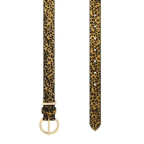 Designed to pair perfectly with your favourite jeans, this furry leather belt features a stylish leopard print and round, gold-tone buckle.