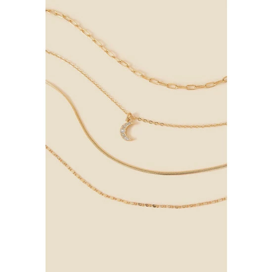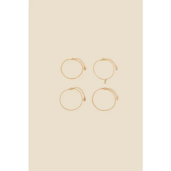 Four different styles of chain creates this set of anklets, featuring everything from sleek snake chain to classic cable chain. Designed in gold-tone metal, it’s finished with a single moon charm – style them out to holiday dinner reservations to show them off!