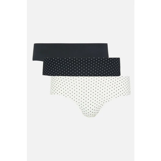 A seamless design in a flattering style, these brazilian knickers are our go-to on days we require no VPL! Designed in soft stretchy fabric, this multipack includes two spotty-print knickers and one plain black.