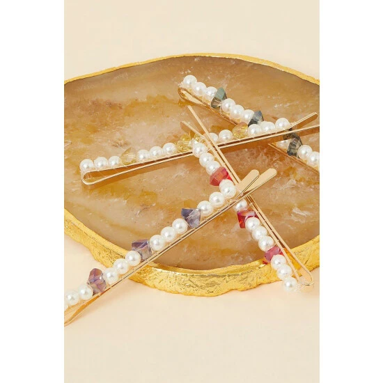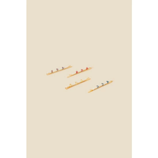 Boasting a unique colour on each piece, these gold hair slides boast pretty pearls with a crystal style chip stationed throughout. Four included.