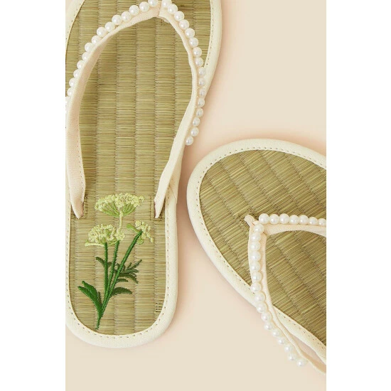 Take holiday dressing to the next level when styling this pair. Full of detail, they’re embroidered on the seagrass footbed with a botanical design whilst the toe-post straps are finished in real pearl for a luxurious finish.
