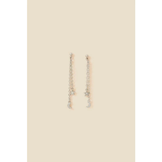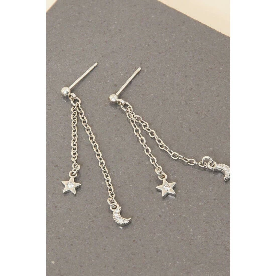 What a better pairing that moons and stars to elevate your night-out attire? Designed in platinum-plated metal, these earrings feature a long chain drop with celestial charms to the end, embellished with teeny cubic zirconia crystals.