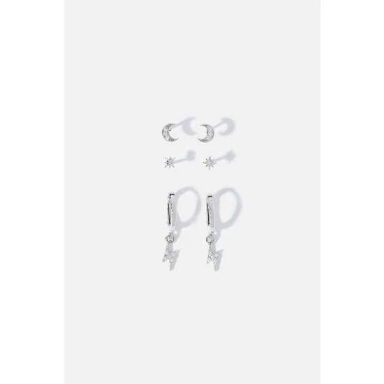 As shiny as the stars: this set of six can be worn mix’n’matched or as three separate pairs. Designed in platinum-plated metal with crystal embellishments, this set includes both studs and hoops.