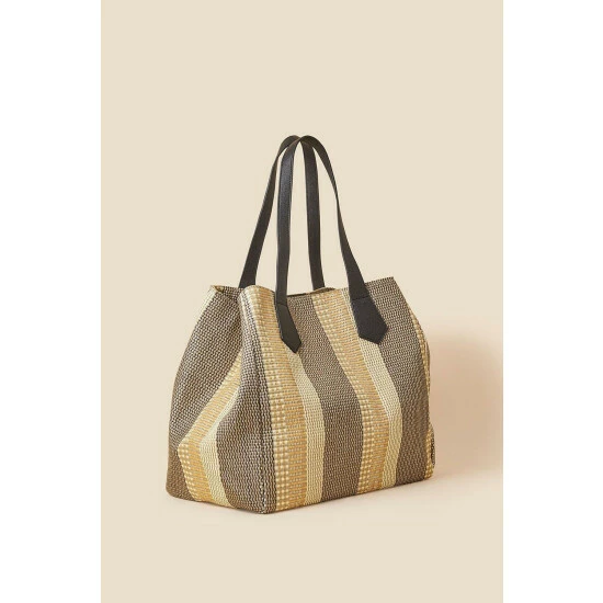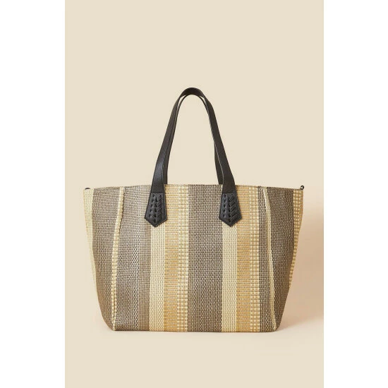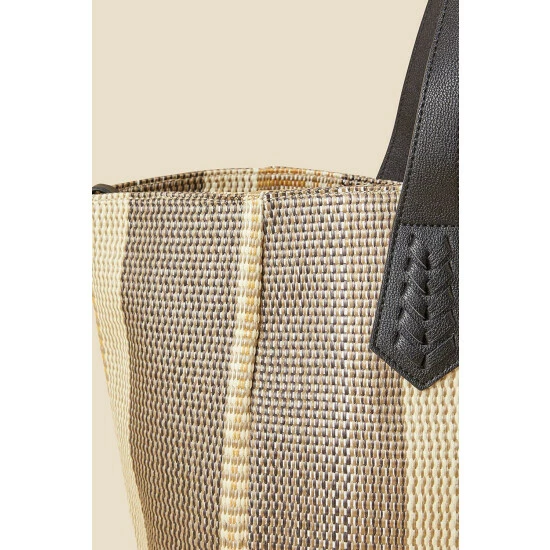 Woven in a raffia finish, this bag is the perfect size to fit all your summer belongings for long beach days and trips to the lido. It features a stripe design, with faux leather straps that sit securely on the shoulder. To the inside is a dog clip for extra security, keeping your sarong, water bottle, and good book safe.