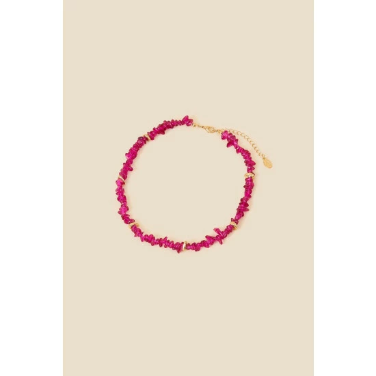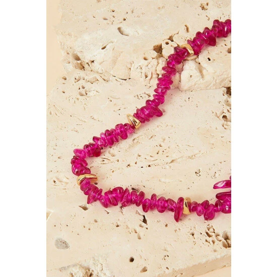 Hop on the fuchsia trend, right down to the accessories with this necklace. It features small raw cut stones threaded between gold-tones for an extra bit of shine.