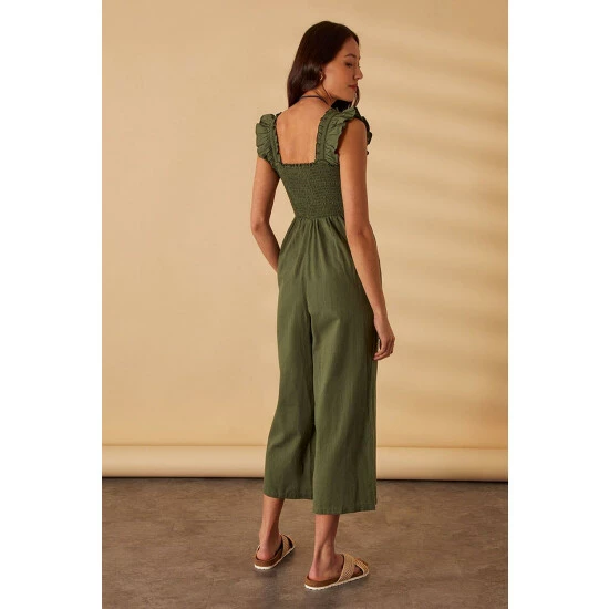 Keep things easy breezy on sunny days with this khaki jumpsuit, featuring a square neck, shirred bodice and wide cut through the leg. Team with white trainers and a straw shoulder bag for casual walks along the beach and picnic stops.