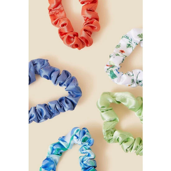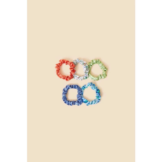 A set of spring time tones for everyday, make your ponytail pop with these satin scrunchies. Five included.