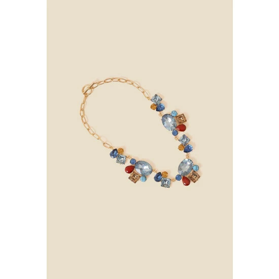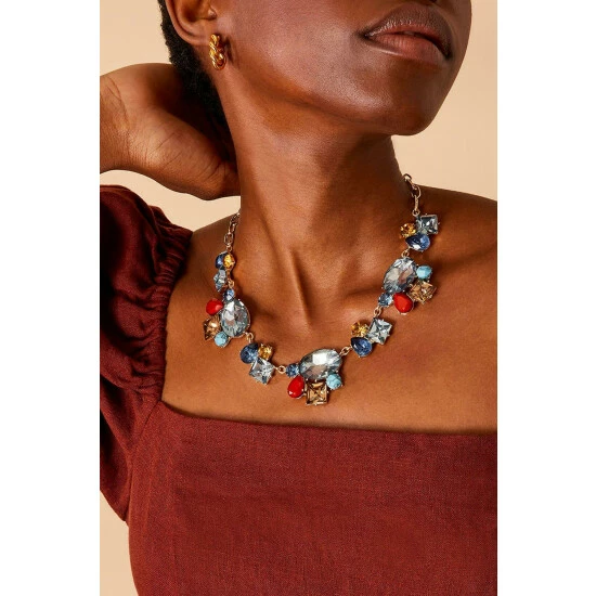 Featuring a sparkling collection of eclectic stones, this statement necklace is comprised of a mix of warm amber tones with cool aqua tones for a timelessly chic addition to your look. Crafted on a gold-tone chain necklace, this piece fastens securely with a T-bar closure.