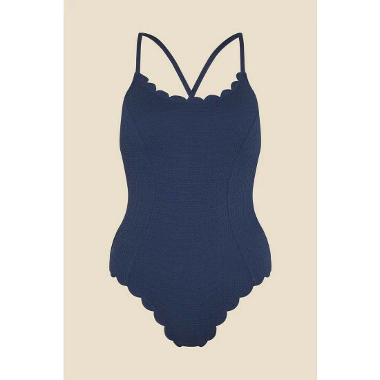 Perfect for sandy shores and sipping cocktails, this swimsuit is designed in textured fabric for a flattering fit. It features scalloped trims throughout, with a scooped neckline and cross-strap detailing to the back. Style it with your best kaftan and strappy sandals for a look that’s ready for the beach bar.